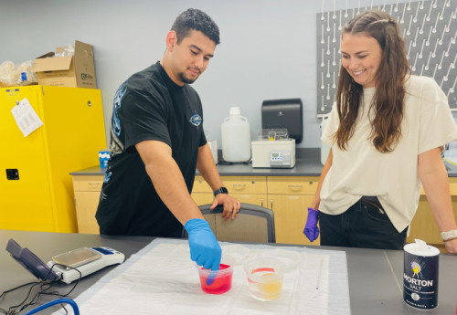 - Kinesiology Students Explore Anatomy, Physiology Through Lab WorkIn a recent kinesiology lab at Cal State San Marcos, students traded textbooks for chicken legs and vinegar in a series of interactive experiments designed to deepen their understanding of anatomy and physiology. Led by kinesiology instructor Megan Paterson, the lab sessions gave students the opportunity to explore osmosis and biomechanics through real-world applications. In one experiment, students soaked eggs in vinegar to dissolve the shells, then placed them in various saltwater solutions and beverages of their choice – with most opting for sodas or sports drinks. By weighing the eggs before and after, they estimated how much water was absorbed, offering insight into osmosis and the salt content of everyday drinks. “This kind of hands-on learning helps students connect theory to practice,” Paterson said. “It’s one thing to read about osmosis; it’s another to see it happen right in front of you.” In the afternoon sessions taught by Joseph Lawrence, students dissected chicken legs to compare the large muscles of the thigh with the smaller ones in the calf. They then conducted a bone-breaking experiment, measuring the length and diameter of chicken femurs and tibias and calculating the force required to break them. The lab also incorporated CSUSM’s Anatomage Tables, allowing students to explore human anatomy in 3D and reinforce their understanding through digital dissection. Inside kinesiology health labs like this, students combine classic techniques with cutting-edge tools, gaining real-world skills that go far beyond textbooks. The experience helps them build a strong foundation for careers in health and human movement. And they’re doing it with purpose. “These labs weren’t just about science,” Lawrence said. “They were about reinforcing confidence, curiosity and community.” These immersive experiences reflect CSUSM’s “Blueprint for the Future,” the name of its recently launched $200 million fundraising campaign. You can support the campaign and fuel more hands-on learning experiences like this. Learn more and give today. Media Contact Brian Hiro, Communications Specialist bhiro@csusm.edu | Office: 760-750-7306